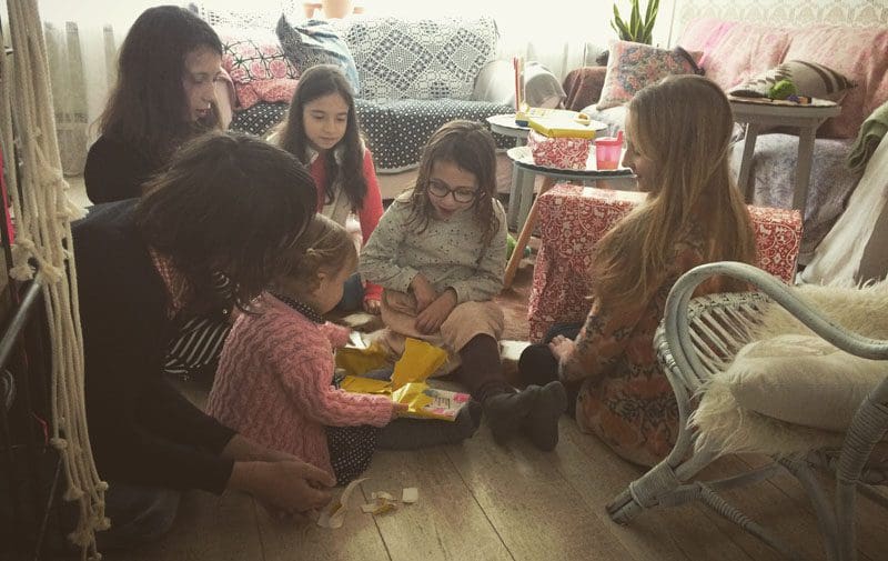 Enfin, per stom toeval kon ik nog de speelhuisvariant in de sale scoren. En toen ik de dag voor haar verjaardag naar de Hema snelde voor een instagram waardige goudkleurige ‘2’ ballon (‘sorry mevrouw, uitverkocht!’ ) griste ik nog wat dikpunters en een kleurboek mee. Eenmaal thuis, zaterdagavond, bleek het inpakpapier net genoeg voor het doosje potloden. Gelukkig hadden we nog iets rood-wit met rendieren over van de kerst. En die kekke slinger in snoepkleurtjes bleek voorzien van een ‘1’ ipv ‘2’ dus scheurde ik die half kapot en vouwde ‘m subtiel tussen de deurtjes van de kast. Van de overbuurvrouw kregen we nog een retro slinger met vlinders in ieder geval beter dan de verschoten plastic variant die ik in de haast afgelopen zomer in een tasje had gepropt na dagenlang in de regen te hebben gehangen.