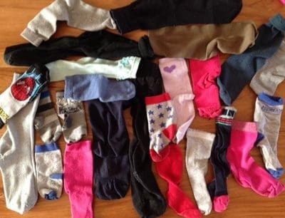 Vijf paar voeten hebben we hier in huis. Mannenvoeten, vrouwenvoeten, meisjesvoeten, jongensvoetjes en meisjesvoetjes. Ik weet niet precies hoeveel paar sokken we samen hebben, maar ik weet wel dat het er te veel zijn.