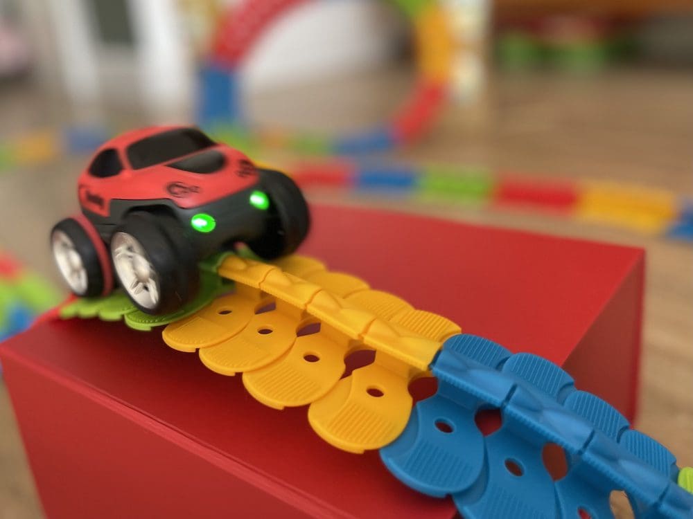 Je kunt met de baan bochten, loopings, en een twist maken. Wanneer je de baan de lucht in laat gaan, moet het wel ondersteunt worden met een object. Denk aan een stoeltje of een doos. Maar je kunt dus ook touw gebruiken die je een gaatje in een baanonderdeel vastknoopt. Dit doe je onder andere wanneer je een looping maakt. Gebruik dan twee (volle) flessen om de looping aan vast te knopen. Zo’n looping laten werken is overigens nog best lastig. Je moet er echt voor zorgen dat de looping goed strak zit vastgeknoopt aan de flessen. Wanneer de baan klaar is, kun je de auto (met batterijen die dus zijn meegeleverd, echt een pluspunt) op het beginstuk van de baan zetten. Achterop de auto zit een knopje om de auto aan en uit te zetten. De auto beweegt zichzelf voort en wanneer alle baanonderdelen goed zijn vastgeklikt, blijft de auto op de baan rijden.