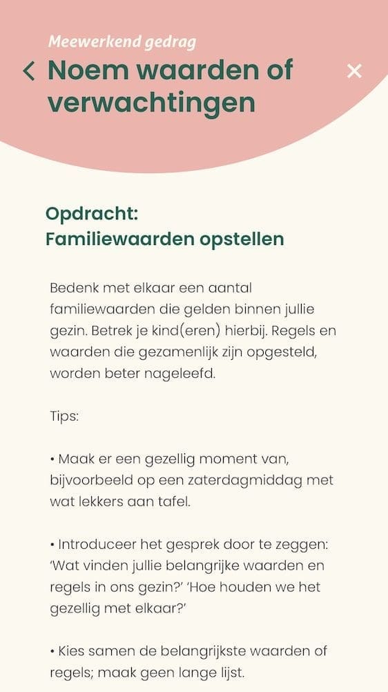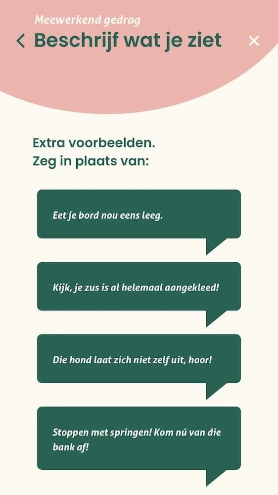 Naast de training zijn er ook podcasts in de app te beluisteren en je vindt er ook veelvoorkomende situaties met voorbeeld-reacties zodat je deze direct kunt gebruiken in je eigen communicatie met je kind. Dit gaat van treuzelen tijdens het ochtendritueel tot omgaan met verdriet door overlijden. Naast de training biedt de app dus nog veel meer content die je kan helpen in het opvoeden.
