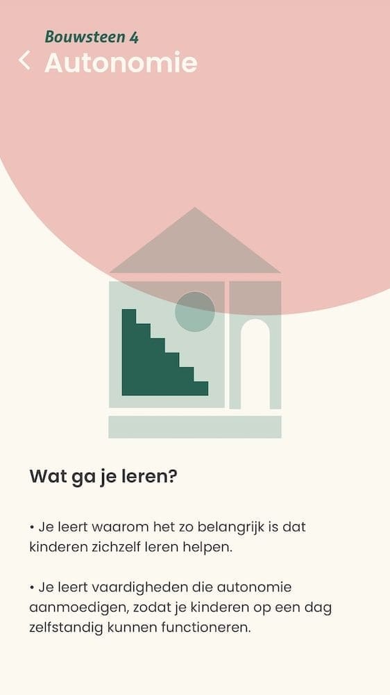De app bevat de volledige Howtotalk training. In zes interactieve modules leer je hoe je je communicatie met je kinderen kunt verbeteren. Deze zes interactieve modules, ze noemen dit in de app ‘bouwstenen’ doorloop je door oefeningen te doen. Dit kun je helemaal op je eigen tempo en in je eigen tijd doen. En heel handig, soms helpt de app je eraan herinneren dat er weer getraind kan worden.