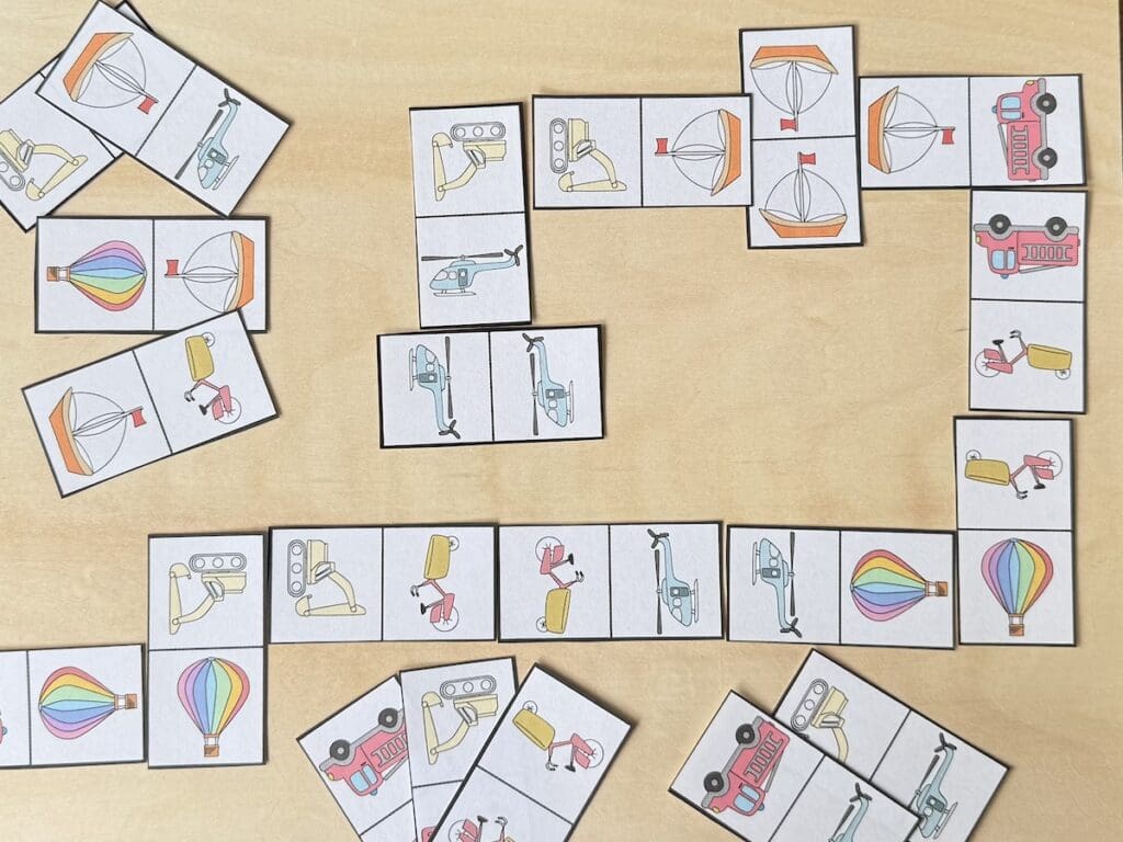 Plaatjes verbinden met hetzelfde voertuig of aantallen. Goed voor het herkennen van vormen, logisch denken en concentratie.