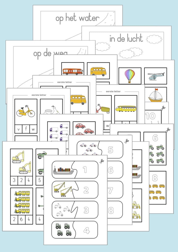 Laat kinderen op een speelse manier kennismaken met letters in combinatie met voertuigen. Denk aan: zoek de juiste letter bij het voertuig, schrijf de eerste letter van “bus”, “vliegtuig” of “boot”.