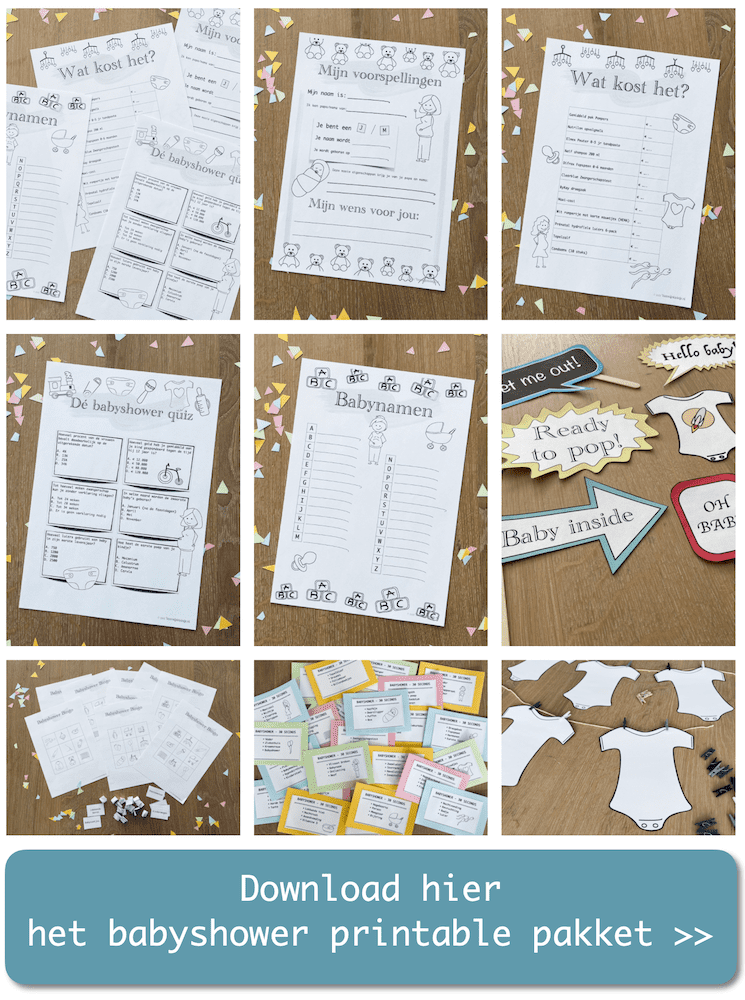 - 30 seconds babyshower editie – Dit kun je zelf maken, maar het zit ook in onze babyshower printable pakket. Het spel gaat hetzelfde als het originele 30 seconds, maar dan maak je kaartjes met alleen maar baby gerelateerde woorden. Dit kan zeer grappig uitpakken, hoe omschrijf je bijvoorbeeld een bevalling of een totaalruptuur.