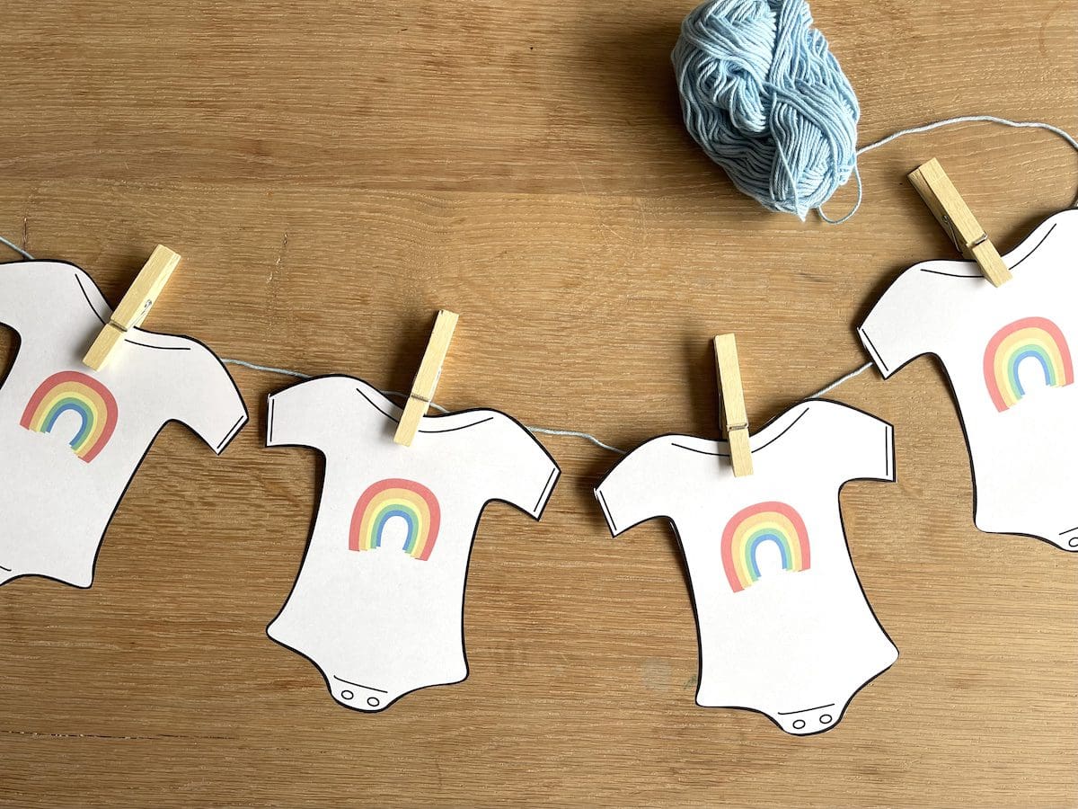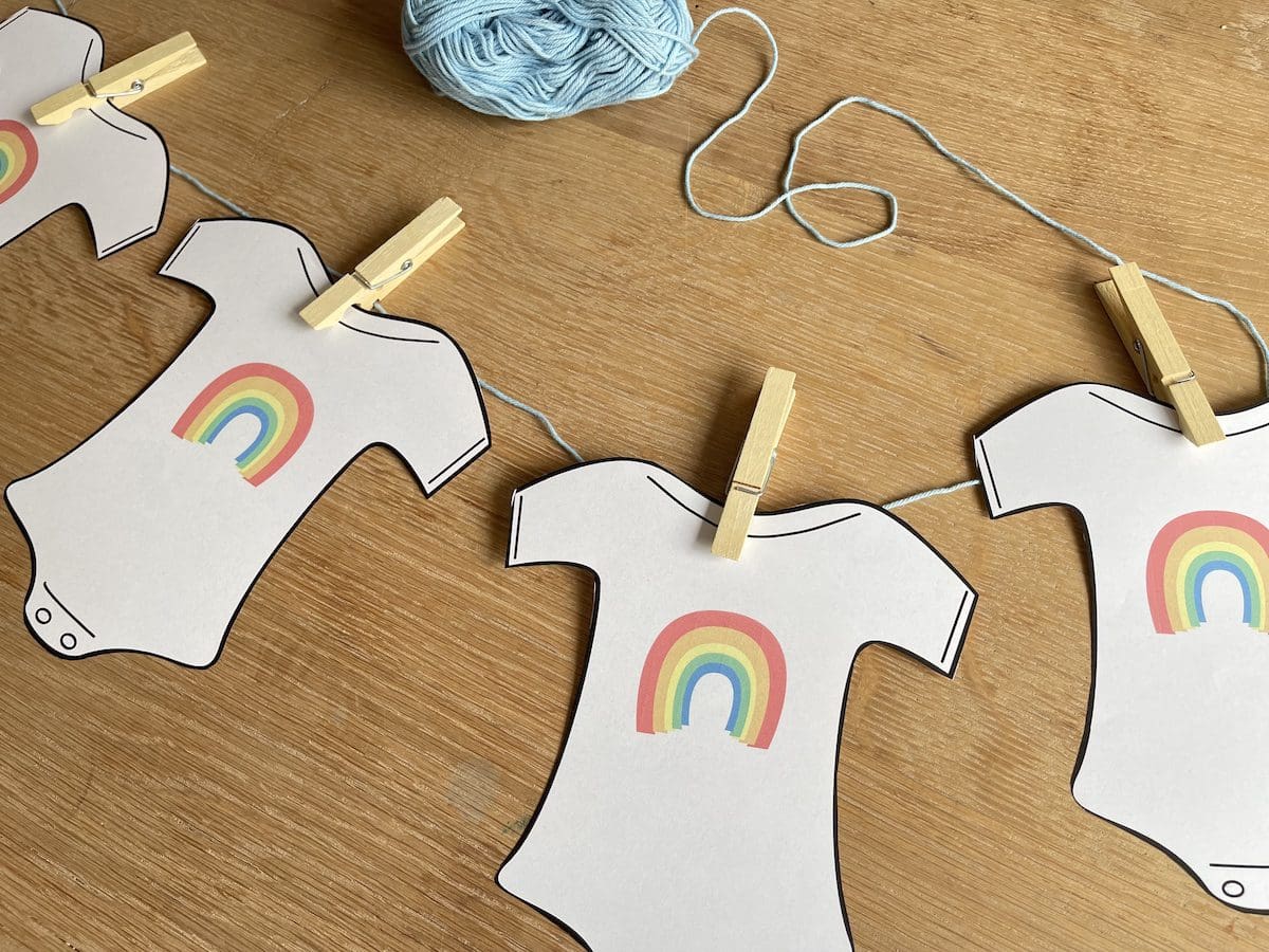 - Prints (rompers met regenboog) voor een babyshower slinger