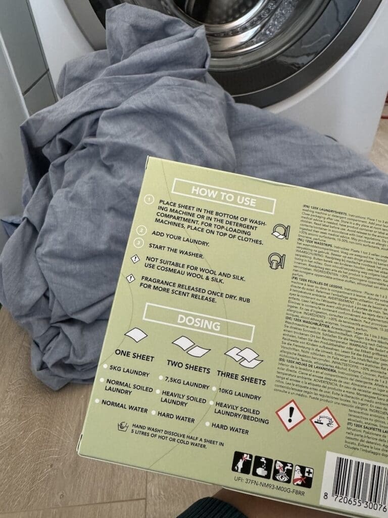 Als ik denk aan hoeveel wasmiddel wij gebruiken, leek de overstap naar wasstrips me ook een stap in de richting van milieuvriendelijker wassen. De strips van Cosmeau zijn biologisch afbreekbaar en vrij van schadelijke chemicaliën, wat me een goed gevoel geeft. De verpakking is ook kleiner dan die van een traditionele fles wasmiddel, waardoor ik minder afval heb. En dat is een groot pluspunt in ons huishouden waar duurzaamheid steeds belangrijker wordt (en de afvalbak voor plastic eigenlijk altijd veel te vol zit). Ik had er dan ook echt al wel vaker aan gedacht om te beginnen met wasstrips, maar ik dacht altijd dat ik dan een stuk duurder uit was.