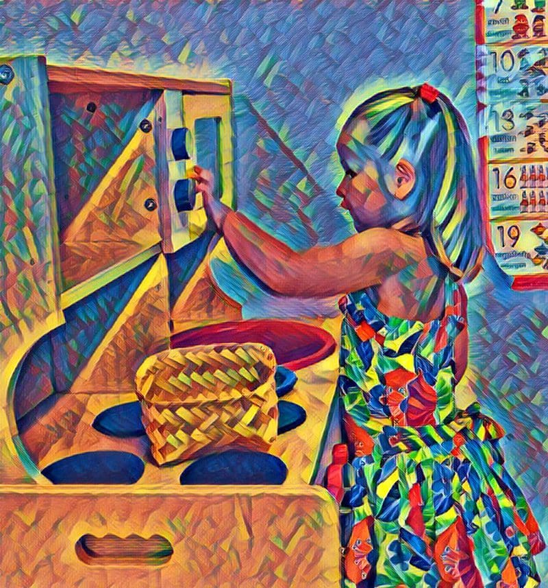 Weer behangen met haar nu volle rugzakje stapt ze dapper over het grote schoolplein. En ja hoor, net zoals bij het proef ochtendje verdwijnt ze direct in de keuken hoek waar ze een pop in de oven probeert te bakken. Dat geeft niet, want ze moet haar psychopathische neigingen tenslotte nog afleren in deze peuterspeelzaal jaren. Heeft de juf nog een uitdaging naast alle luiers en huilende peuters die er misschien nog niet zooo aan toe zijn.
