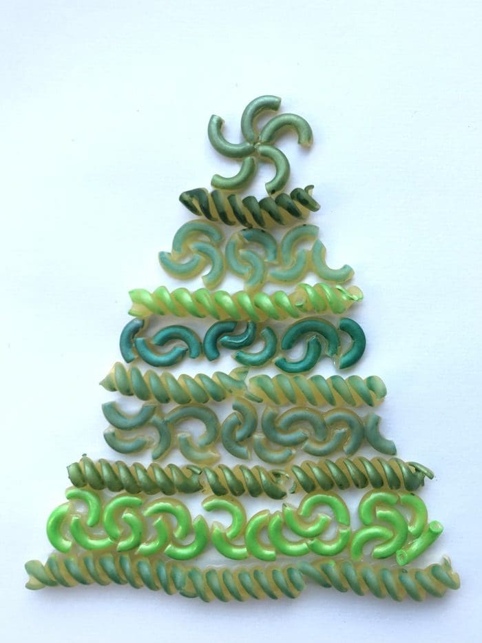 Deze kerstboom knutsel is voor alle leeftijden leuk om te maken. En het is vooral leuk om van al die verschillende leeftijden de resultaten te zien! Wat je nodig hebt is macaroni, wokkelpasta en metallic verf (of stiften zoals wij deden).
