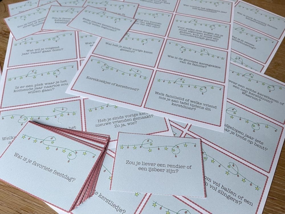 Om dit tijdens het kerstdiner te doen, kun je ons blog erbij pakken, maar je kunt ook onze printable kopen. Op de printable staan de vragen op een kaartje geschreven. De printable kun je dan uitprinten, zelf uitknippen en zo heb je heel simpel een set kaartjes met leuke vragen voor tijdens het kerstdiner.