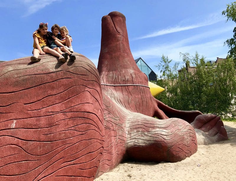 We parkeren onze auto in de parkeergarage Rozet. Door hier te parkeren zijn we direct in het centrum en stuiten we direct op Het Feestaardvarken. Nu hoor ik je denken, ‘een Feestaardvarken?’. Nou dat gevoel had ik in eerste instantie ook een beetje. Maar wanneer mijn kinderen het gigantische kunstwerk zien, beginnen ze meteen te klimmen. Het kunstwerk, gemaakt door Florentijn Hofman, staat in het centrum van Arnhem tegenover Rozet. Het is gemaakt van beton en staal, is 30 meter lang, 9 meter hoog en 13 meter breed. Je begrijpt, hier zijn de kinderen wel even mee bezig om te ontdekken hoe hoog ze durven te klimmen. En terwijl de kinderen lekker spelen, zoek ik even wat de achterliggende gedachte van het Feestaardvarken is. Het is een geschenk van Burgers’ Zoo aan de stad Arnhem, ter ere van hun 100-jarige bestaan.