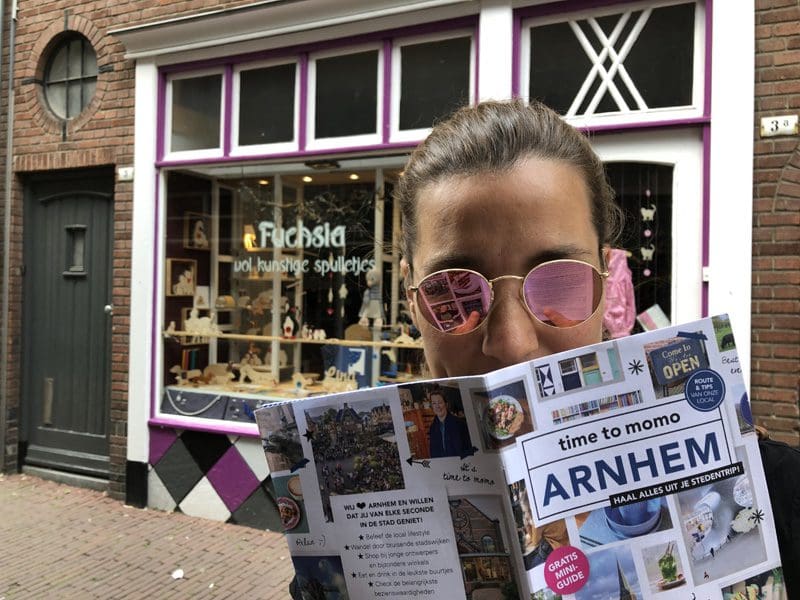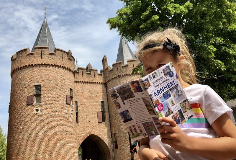 Arnhem, mijn kinderen kennen het van naam door een recent bezoek aan het openluchtmuseum, van topo als hoofdstad van Gelderland en van verhalen over de Tweede Wereldoorlog. Maar echt de stad bezocht, dat hadden we nog nooit eerder met de kinderen gedaan. Tot afgelopen maandag, Tweede Pinksterdag. Het bleek een uitstekende dag om de stad met de kinderen te verkennen samen met de miniguide van time to momo. Het bekende time to momo heeft Arnhem namelijk als ‘Stad van de Maand’ juni uitgeroepen en is als miniguide verkrijgbaar in de boekhandel of je downloadt een wandelroute door Arnhem via timetomomo.com.