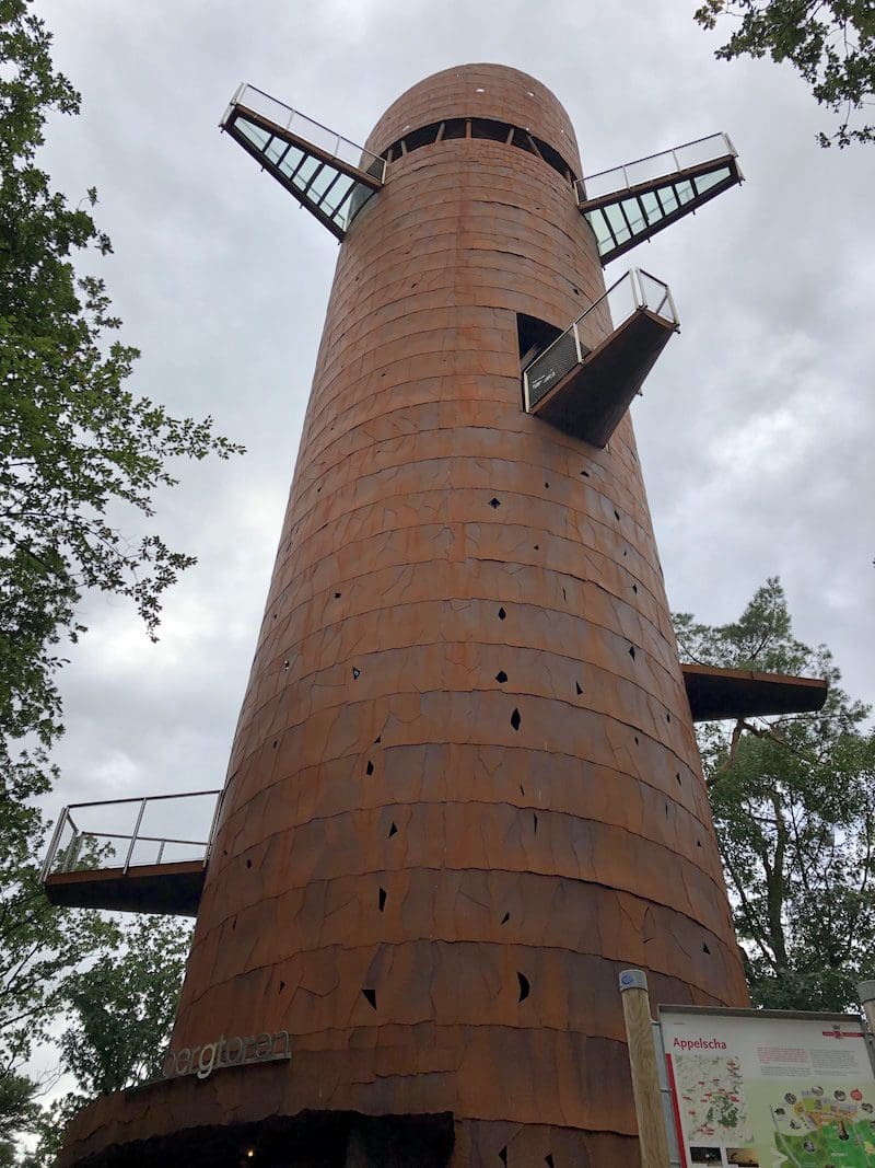 De uitkijktoren van maar liefst 33 meter hoog staat in Appelscha en voor wie denkt dat Friesland plat is… die heeft het mis! In het Andere Friesland staat deze Bosbergtoren op het hoogste punt, een 20 meter hoog stuifduin, van het Friese vasteland. Het ontwerp is geïnspireerd op een reusachtige dennenstam, maar vooral de uitstekende glasplaten maken deze toren een hele belevenis. Mensen met hoogtevrees doen het niet heel lekker boven op de toren, dat heeft de man wel bewezen. Mijn kinderen daarentegen kennen geen vrees en banjeren vrolijk over de glasplaten hoog boven de grond.