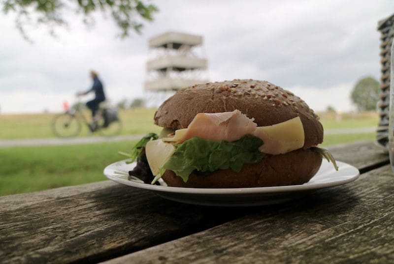 De eerste hotspot van onze fietstocht is de uitkijktoren in het Aekingerzand, ook wel ‘De Kale duinen’ genoemd, waar we uiteraard ook even een kijkje nemen. Een perfecte plek voor een picknick, hoewel het van mij wel iets minder mocht waaien. Helaas is het weer nog steeds niet op bestelling en dus doen we het ermee. Bovendien maakt de overheerlijke inhoud (mét ambachtelijke appeltaart) van de picknickmand een hoop goed.