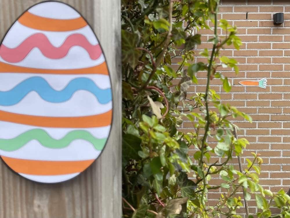 Je maakt een route voor de eieren speurtocht in huis of buiten in de buurt. Zo hang je bijvoorbeeld het ene ei in de wc en het volgende paasei in het trapgat enzovoorts. Wanneer je de speurtocht buiten doet, begin je bijvoorbeeld bij de voordeur. Ook ontvang je een printable met wegwijzers in de vorm van een wortel, zodat je de kinderen op weg kunt helpen om de juiste route te volgen. En uiteindelijk zullen de kinderen bij het gouden ei aankomen!