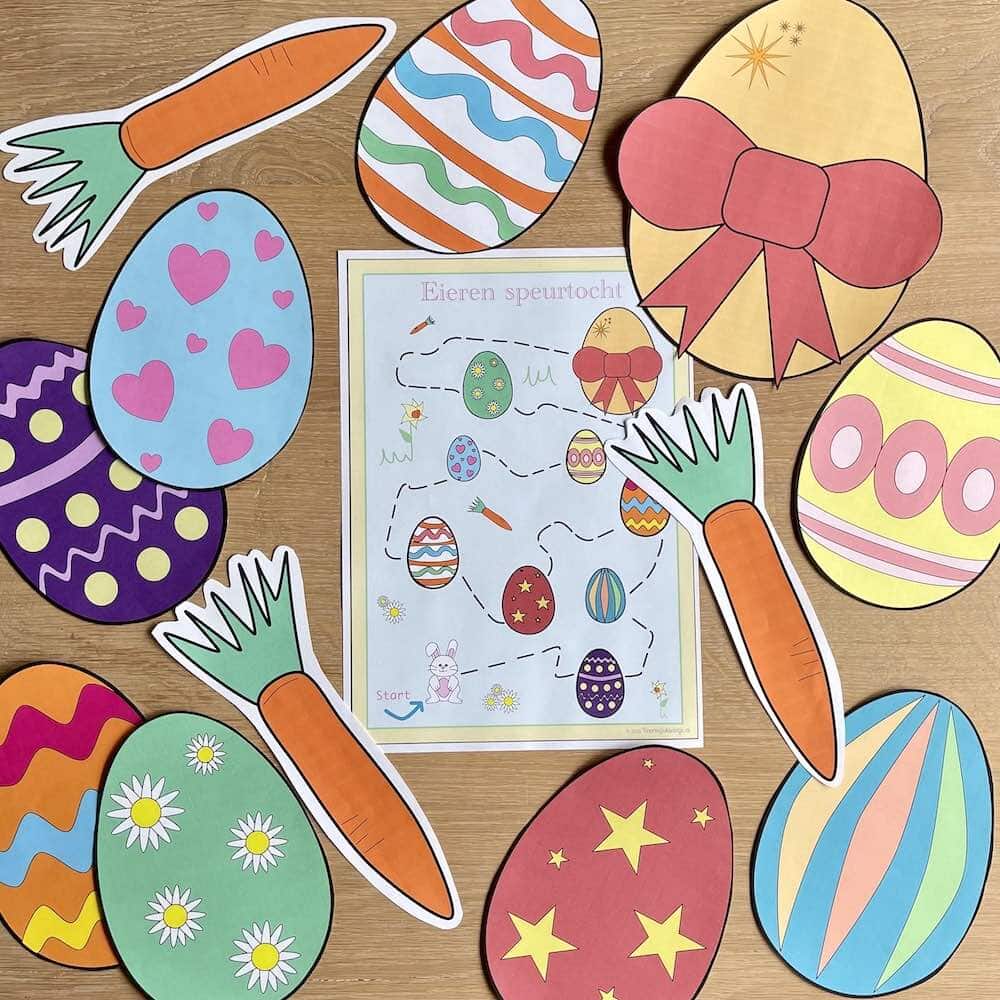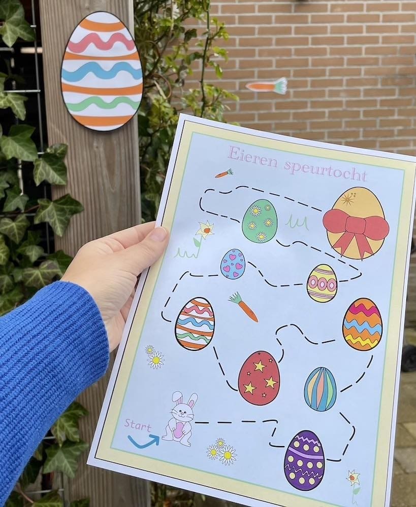 Wil je er echt een leuke paasactiviteit van maken, zet dan een eieren speurtocht uit. Dit kun je met de printable in huis doen. Maar je kunt de speurtocht ook buiten uitzetten. Extra leuk om de eieren speurtocht met de buurtkinderen te spelen. Altijd leuk om je buren na een winterslaap weer buiten te zien toch?