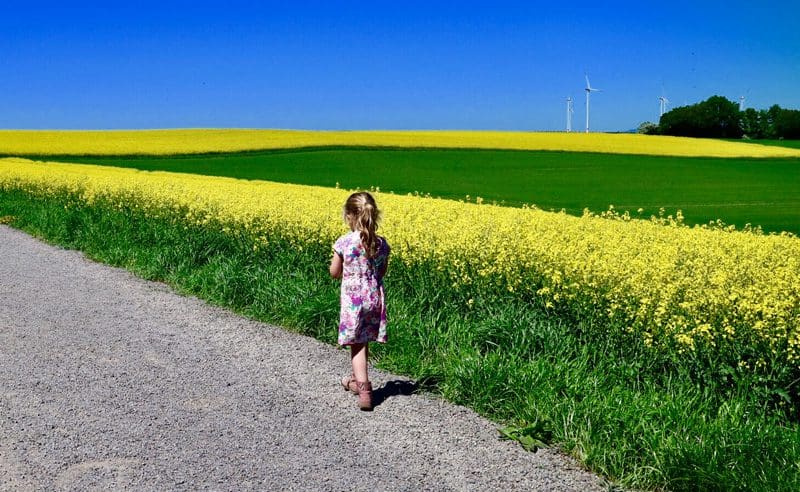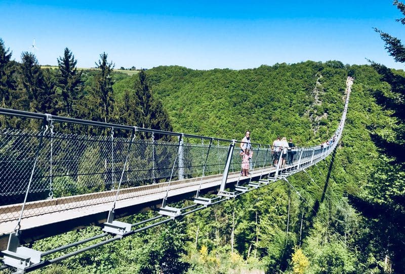 Een wandeling die wel goed te doen is met kinderen, is de wandeling naar één van de grootste hangbruggen van Duitsland: Geierlay. Vanuit Sosberg is de wandeling zo’n 1,8 kilometer. We liepen vanuit Sosberg langs velden vol gele bloemen. Van een afstand konden we aan de vele mensen al zien waar we wezen moesten. We waren dus duidelijk niet de enige die de gigantische hangbrug wilden oversteken. Toen ik zelf eenmaal halverwege was, zag ik de noodzaak ook niet meer om verder te lopen over de 360 meter lange en 100 meter hoge brug. Maar dat was altijd nog verder dan de 10 meter die de man en kinderen wisten te trotseren. Kortom, hoogtevrees is niet handig bij het oversteken. Maar alleen het aanschouwen van de Geierlay hangbrug is de wandeling van 1,8 km al waard.