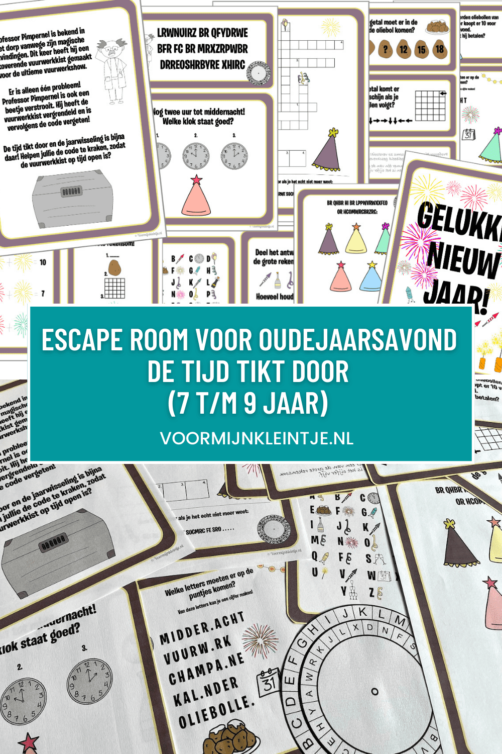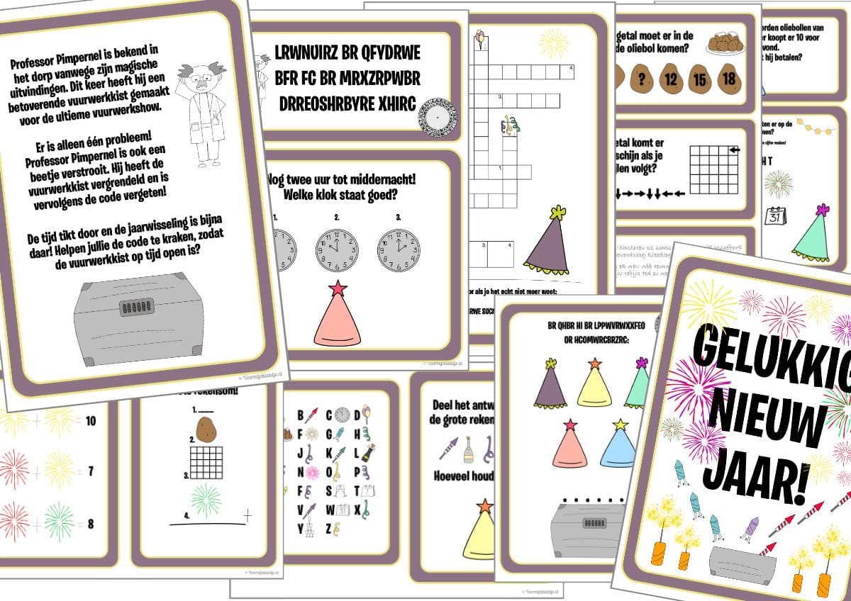 De escape room voor oudejaarsavond voor kinderen van 7 tot en met 9 jaar kun je hieronder bestellen. Deze ontvang je dan direct in je mailbox en kun je thuis zelf printen. Je hebt ongeveer een kwartiertje nodig om de escape room voor te bereiden. Je moet natuurlijk alle printables printen. Er zijn een aantal printables die uitgeknipt moeten worden, onder andere de geheimtaal schijf. Als je een lamineer apparaat hebt, kun je de schrijf voor het mooie ook nog lamineren.