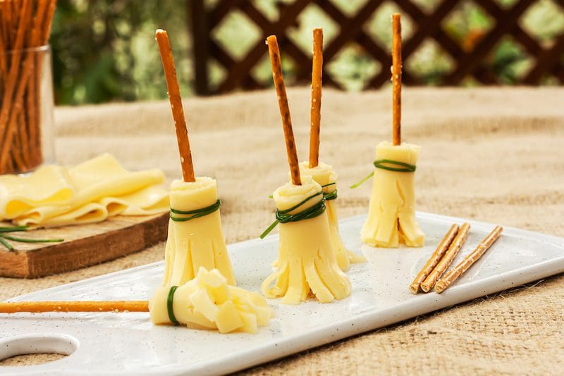 Dit is een leuk Halloween hapje voor tussendoor, die de kinderen heerlijk zullen vinden! Je maakt het door in een dikke plak kaas strookjes in te snijden, op te rollen en vast te knopen aan een zout stokje.
