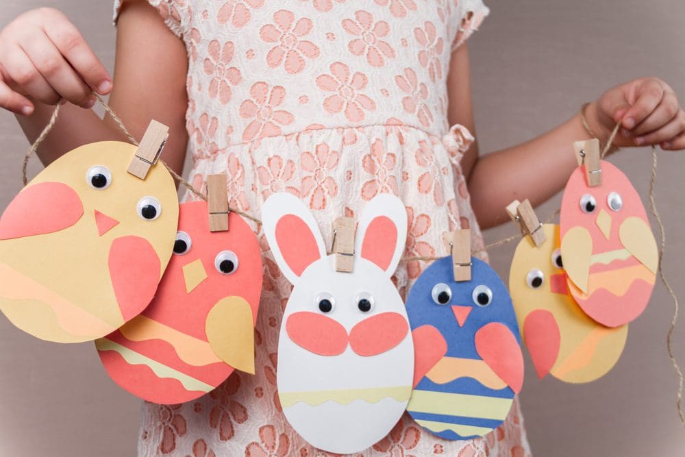 Deze paasslinger knutselen is leuk voor kinderen die iets meer uitdaging zoeken. Je kunt de paaseieren omtoveren naar paasfiguren en als resultaat krijg je een superleuke slinger.