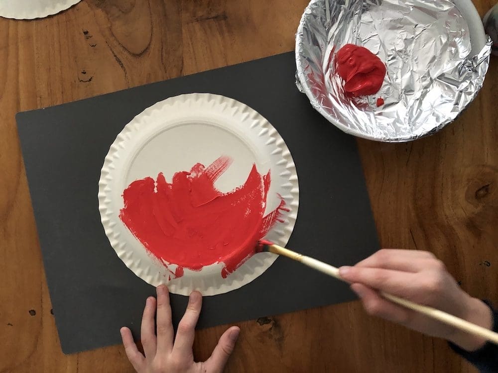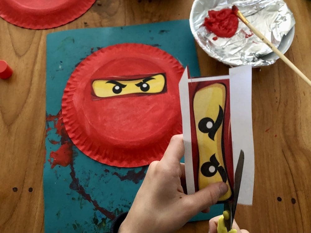 Je begint met de papieren bordjes rood te schilderen. Of groen wanneer je kleintje kiest voor een groene Ninjago. Voor de ogen kun je de printable gebruiken die we bij het Ninjago feestje gebruikten. Wanneer de verf op de papieren bordjes droog is, kun je de ogen op de rode bordjes plakken.