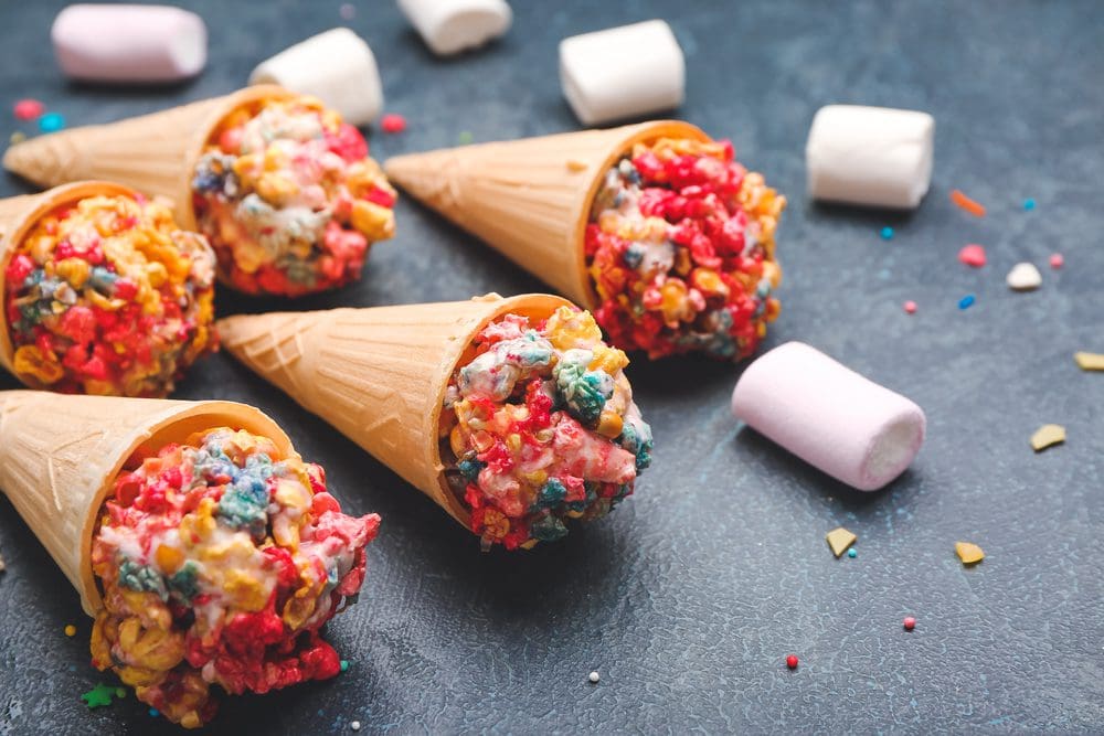 Eenhoorns hebben een magische werking op meisjes en daarom is deze eenhoorn popcorn traktatie super leuk voor meiden. Je koopt een set roze bekertjes, of een ander zoet kleurtje en een zooi puntzakken. De puntzakken vul je met popcorn. Eventueel doe je er ook gepofte rijst erbij, staat wel vrolijk door de kleurtjes. Deze puntzak plak je dicht, de bekertjes zet je op z”n kop en je plakt de puntzak op de bodem van het bekertje. Als laatste teken je gesloten oogjes op de bekertjes en klaar is je zoete popcorn traktatie.