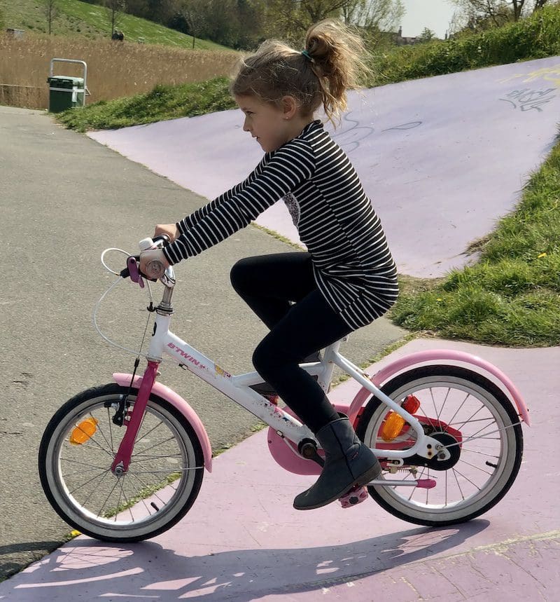 Eén van de eerste B’twin kinderfietsen die wij aan onze wagenpark in de tuin toevoegde, was een 16 inch kinderfiets. Dit fietsje van Decathlon is een vrij complete kinderfiets om mee te beginnen. Onze ervaring is dat de kinderfiets stevig is, tegen een stootje kan en is ook zeer wendbaar. Het stuur en zadel zijn in hoogte verstellen, de kinderfiets kan dus gerust een beetje meegroeien. Zo is mijn dochter van een 16 inch kinderfiets naar een 22 inch kinderfiets (niet van B’twin) gegaan.
