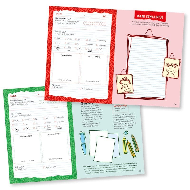 Praten over de scheiding helpt kinderen om de situatie te verwerken. Maar de ervaringen liegen er niet om en blijkt dit in de praktijk vaak erg ingewikkeld. Wat als je kind niet praten wil over de scheiding? Soms wordt een kind zelfs onhandelbaar na een scheiding. Om de scheiding te verwerken als kind, kan het boek Scheidingklets uitkomst bieden! Scheidingklets van het welbekende Gezinnig, is een invulboek voor kinderen (6-12 jaar) van gescheiden ouders. Want met behulp van dit boek kun je met je kind in gesprek gaan over de scheiding en het nodigt kinderen uit om hun gevoelens te uiten.