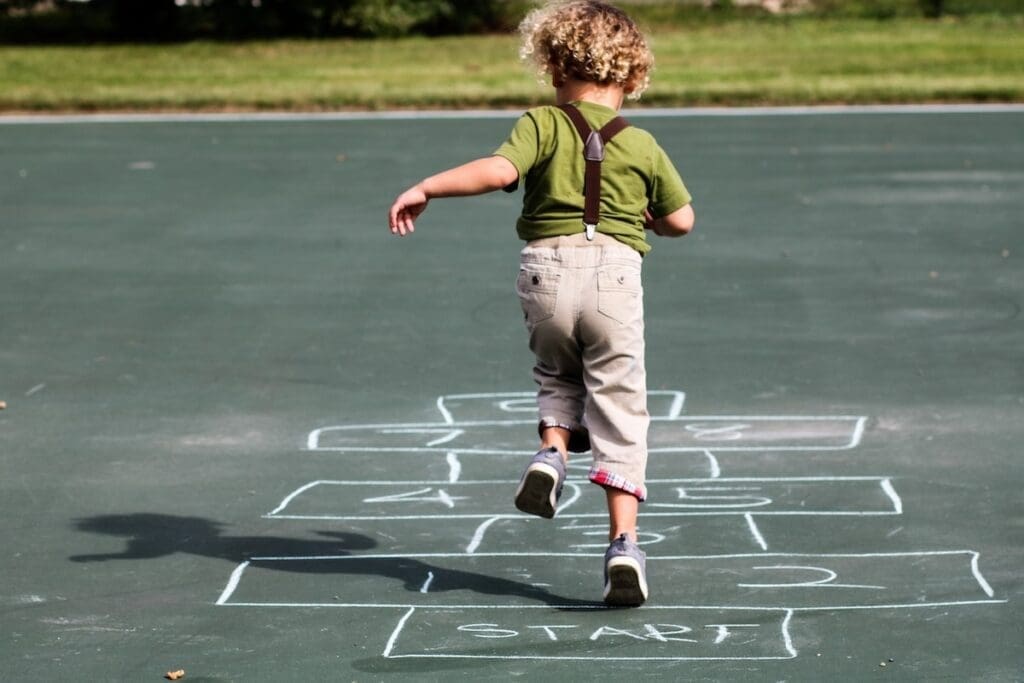Met een krijtje tekenden we een hinkelbaan op de stoep, vaak met vakjes genummerd van 1 tot 10. Je gooide een steentje in een vakje en moest dan hinkelen zonder het steentje of de lijnen aan te raken. De uitdaging was om het steentje op te pakken zonder je evenwicht te verliezen.