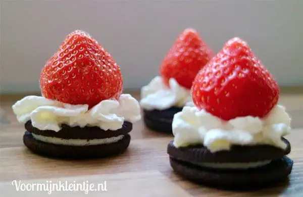 Aardbeien zijn niet alleen lekker zoet, maar door hun vorm perfect om mini-kerstmannetjes van te maken.