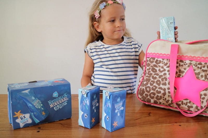 Mijn kinderen zijn redelijk goede drinkers, het liefst geef ik ze water mee naar school. Ik merk dat als ik het leuk verpak, zoals de Wally de Walvis waterpakjes van AH, ze het makkelijker opdrinken. Daarnaast geef ik ook altijd nog een beker met sap mee naar school.