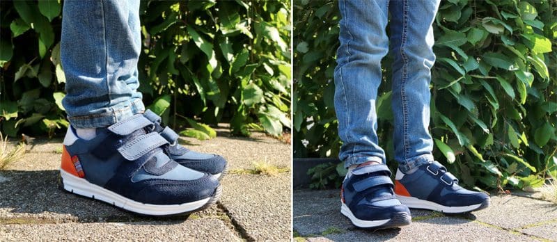 Mijn zoon wil altijd graag ‘snelle schoenen’. Dit kun je natuurlijk op meerdere manieren opvatten, maar eigenlijk bedoelt hij gewoon schoenen die hij snel kan aantrekken en waarmee hij lekker snel rennen kan. De Koel4kids sneaker ‘Benja Dark Blue’ is precies wat hij wil. Geen gedoe met veters stikken, maar klittenbandje open, voet erin, klittenbandje dicht en rennen maar. De kindersneakers zijn gemaakt van nubuk gecombineerd met suede en heeft een gepolsterde textiel voering. Zelf vind ik het oranje stuk op de hiel een heel leuk en speels detail.