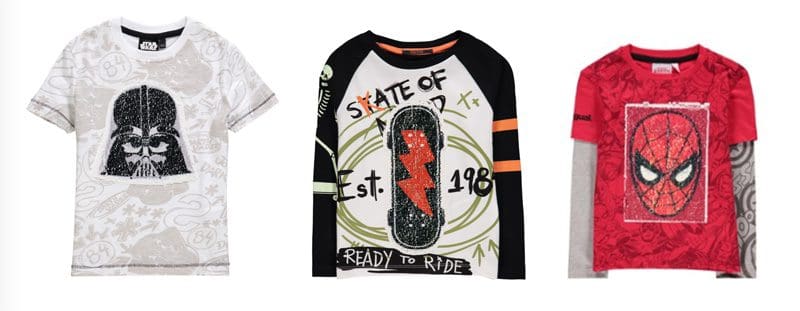 Gelukkig wordt hij gehoord en C&A kwam met een aantal shirts met omkeerbare pailletten, ook wel lovertjes of reversible pailletten genoemd, voor jongens! De afbeeldingen op kleding veranderen door over de lovertjes te wrijven, daarom is de naam wrijf shirt helemaal zo gek nog niet!