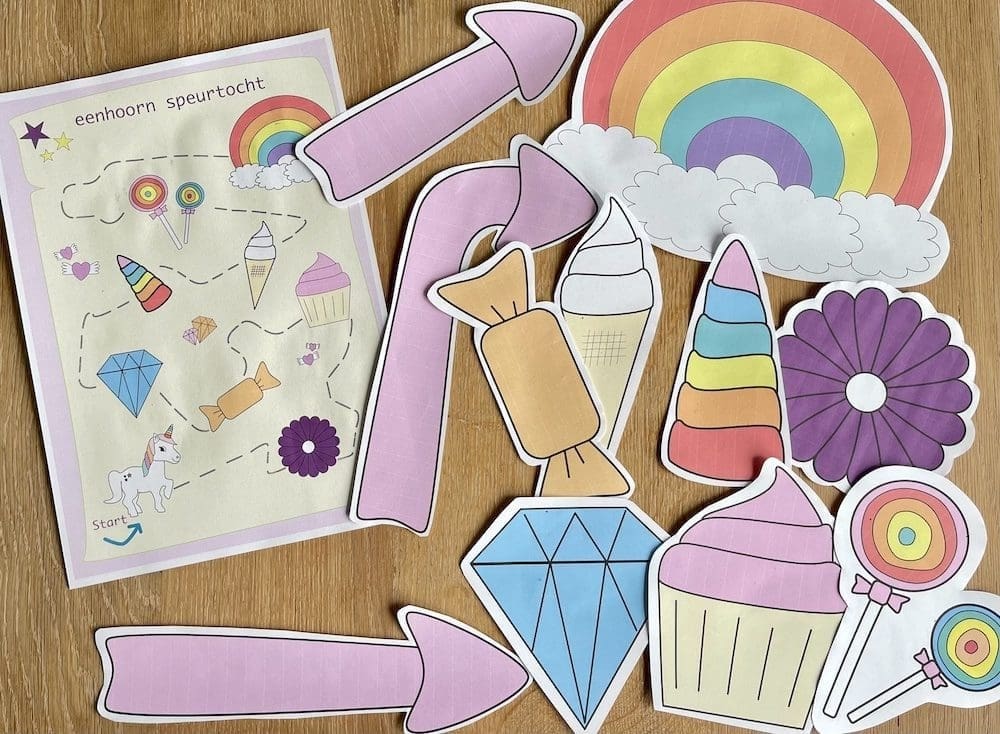Je maakt een route van de speurtocht in huis. Zo hang je bijvoorbeeld het bloemetje in de wc, de diamant in het trapgat enzovoorts. Ook ontvang je een printable met pijlen, zodat je de kinderen op weg kunt helpen om de juiste route te volgen. En uiteindelijk zullen de kinderen bij de regenboog aankomen! Hier kun je de kinderen trakteren op bijvoorbeeld iets lekkers.