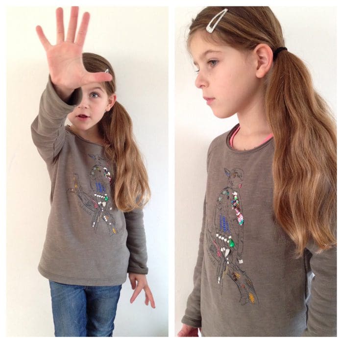 Anyway, het shirt dus. De vogel op het shirt is versierd met pailletten en plastic edelstenen. Het speelse roze hemd dat vast zit onder het shirt maakt, samen met de blingbling, de kleur van het shirt weer helemaal goed. Het gaat om de combinaties probeer ik haar altijd bij te brengen.