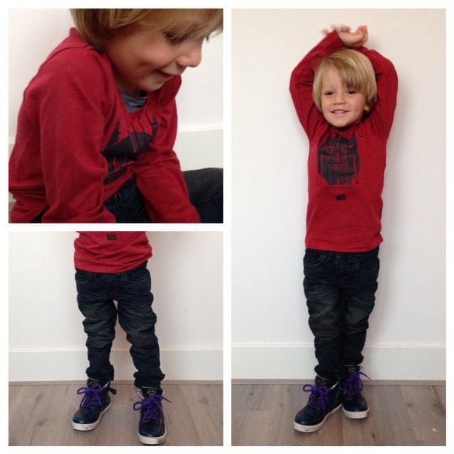 Ook ben ik helemaal weg van de slim fit denim die hij hier draagt. Een mooie donkere look, stoer voor het najaar en de winter. De pasvorm is wederom perfect. Door de verstelbare tailleband kan het broekje precies pas gemaakt worden. Geen geklungel met een riem, want het is toch altijd een lastig dingetje voor een 3-jarige om die zelf vast te maken.