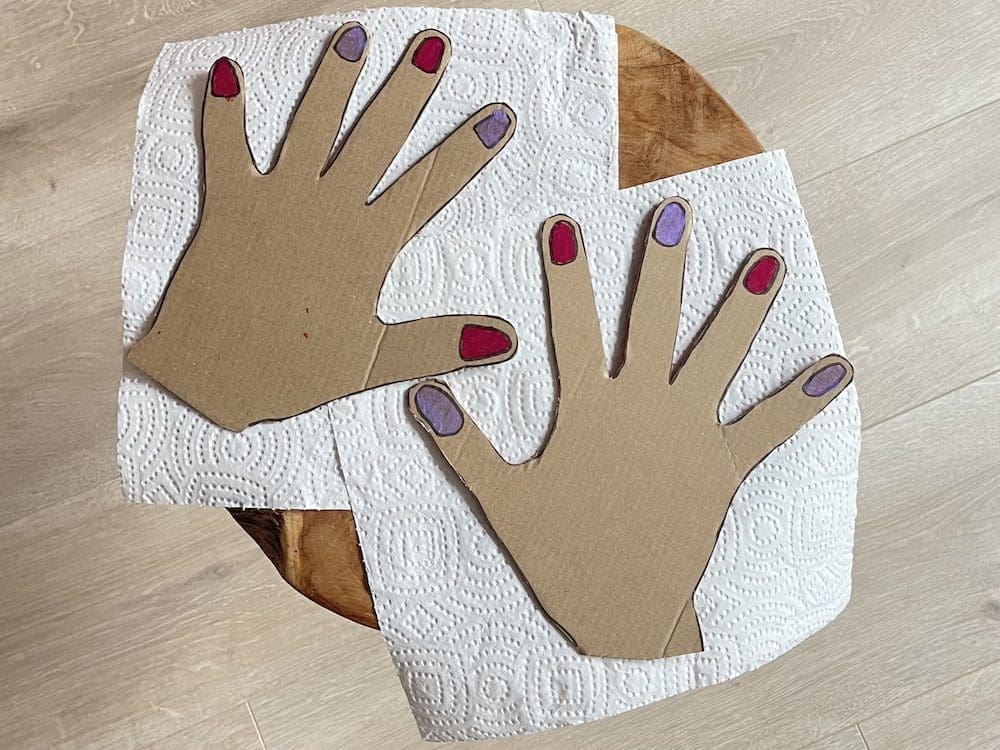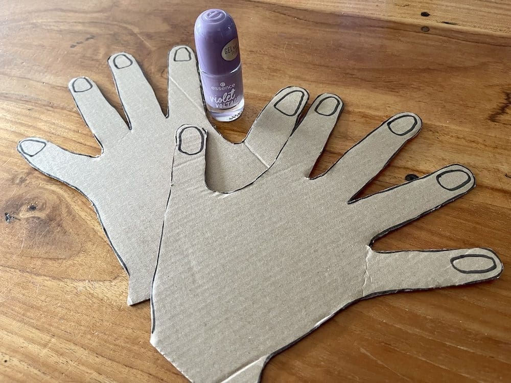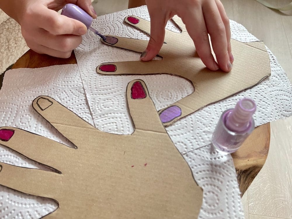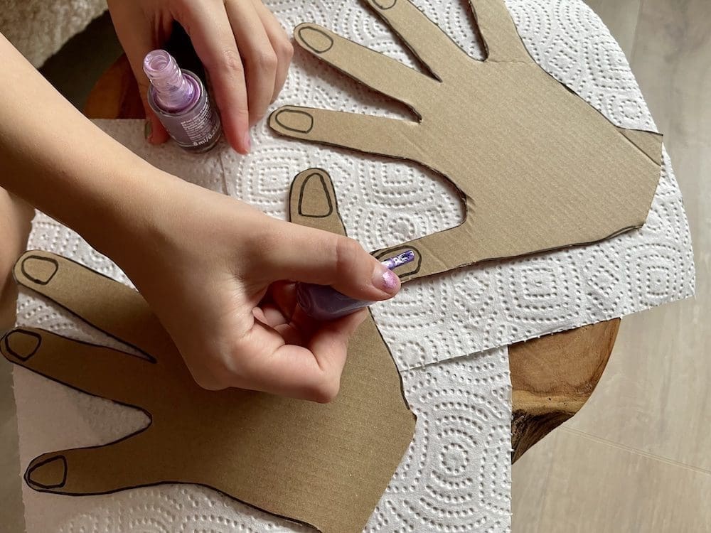 Zoals ik al zei, deze DIY is heel simpel. Je trekt je handen over op een stuk karton. Je tekent de nagels op de juiste plek en vervolgens knip je de handen uit. Nu hoef je alleen nog maar een potje nagellak aan je kleintje te geven en hij of zij kan losgaan op de kartonnen nagels.