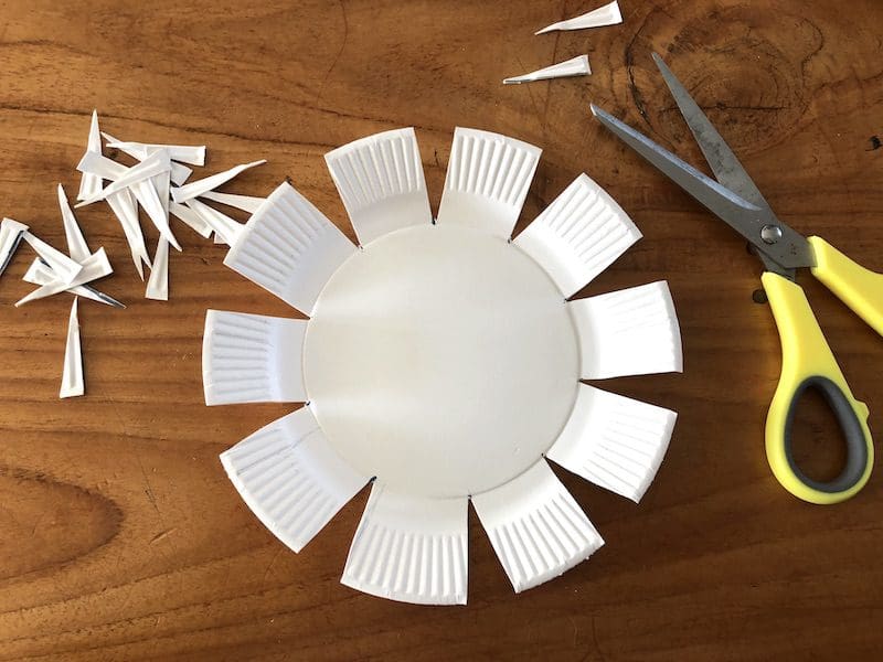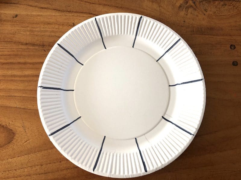 Voordat je kunt beginnen met weven, moet je je papieren bordje een beetje verbouwen. Je begint met het markeren rondom de rand van het papieren bordje. De ruimte tussen je strepen, moet ongeveer even groot zijn. Zo worden je ‘flappen’ gelijkmatig. Daar ga je het bordje ook inknippen, maar niet alleen dat, je knipt een v-halsje uit. Wanneer je dan de flappen naar boven vouwt, overlappen ze elkaar niet. Is dit wel het geval, dan moet je v-hals iets groter.