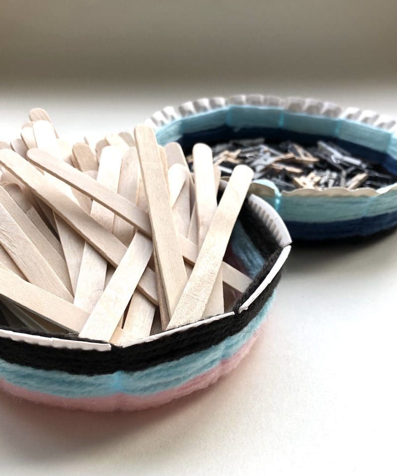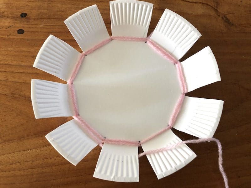 Ga niet te ver door met weven, maar zorg dat er nog een stukje van het papieren bordje over is om om te buigen. Zo glijdt de wol niet van het kommetje af.