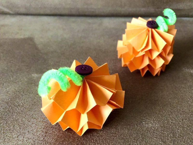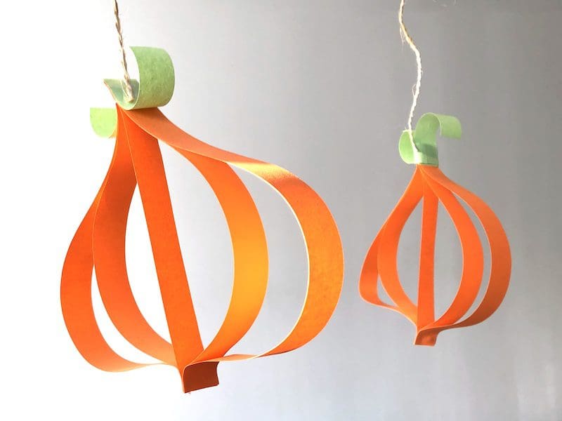 Deze knutsel staat vooral erg leuk in het herfstthema, maar past ook goed bij het thema Halloween. Hoe dan ook, alles wat je nodig hebt zijn vlechtstroken, lijm en touw om de pompoen op te hangen.