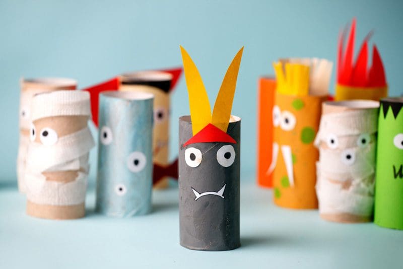 Wat heb je nodig: lege wc rollen, verf, gekleurd papier, afvalmateriaal om mee te knutselen, lijm en een schaar.