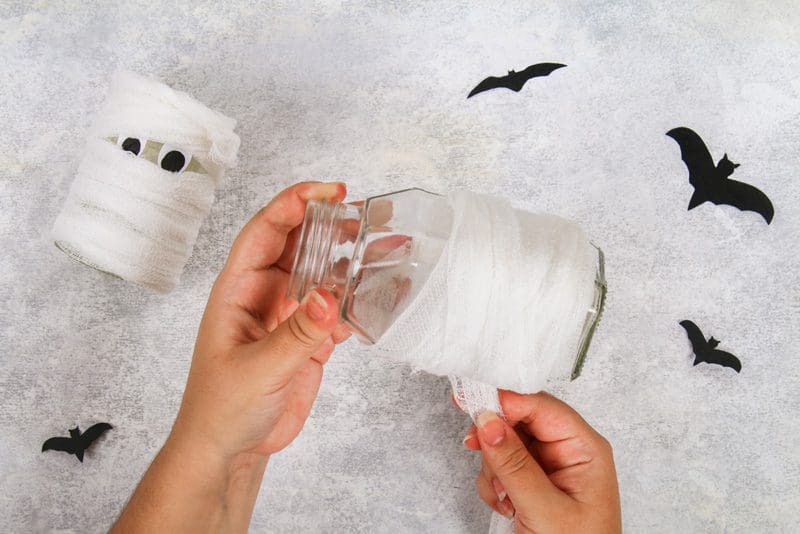 Nog zo’n makkelijke knutsel voor Halloween: een gemummificeerd glazen potje met als eindresultaat een spooky waxinelichtje.