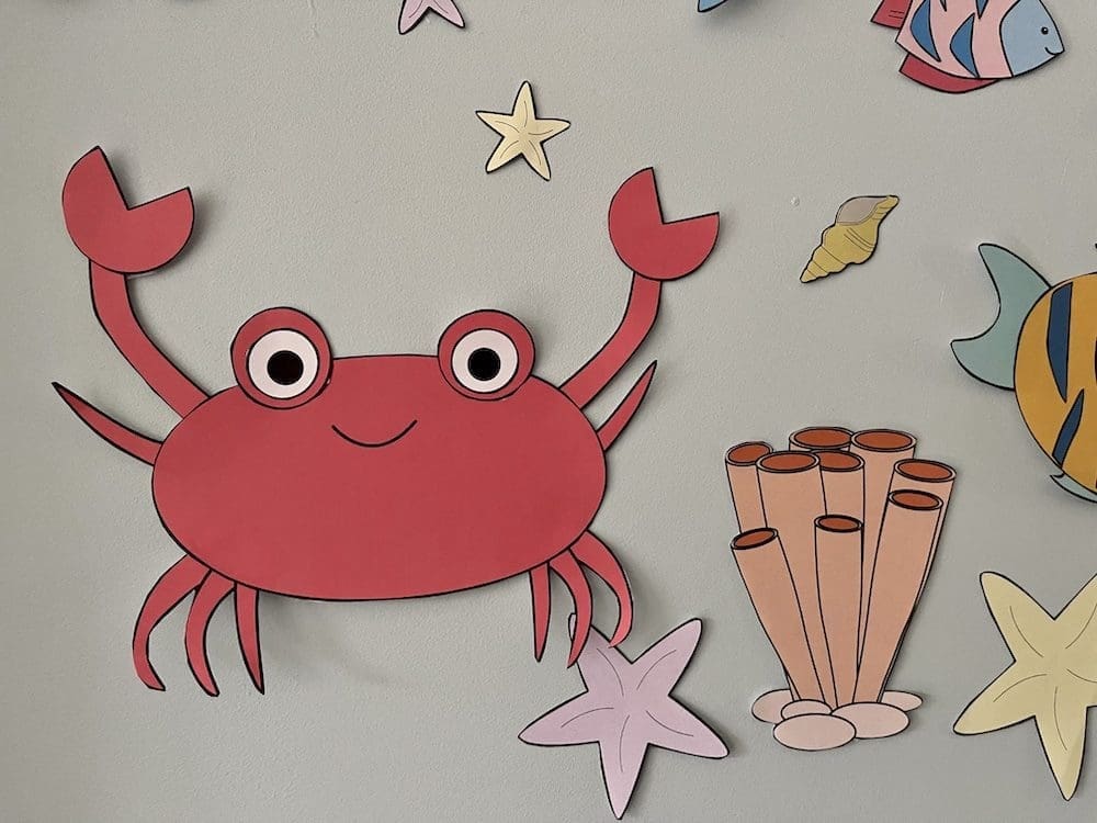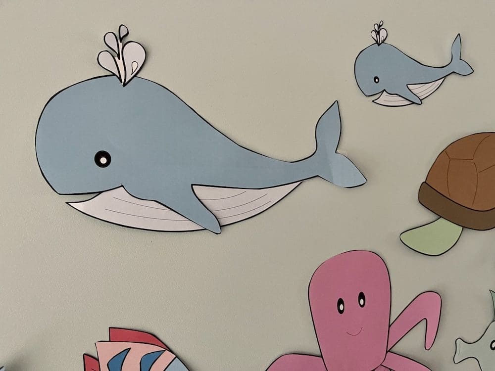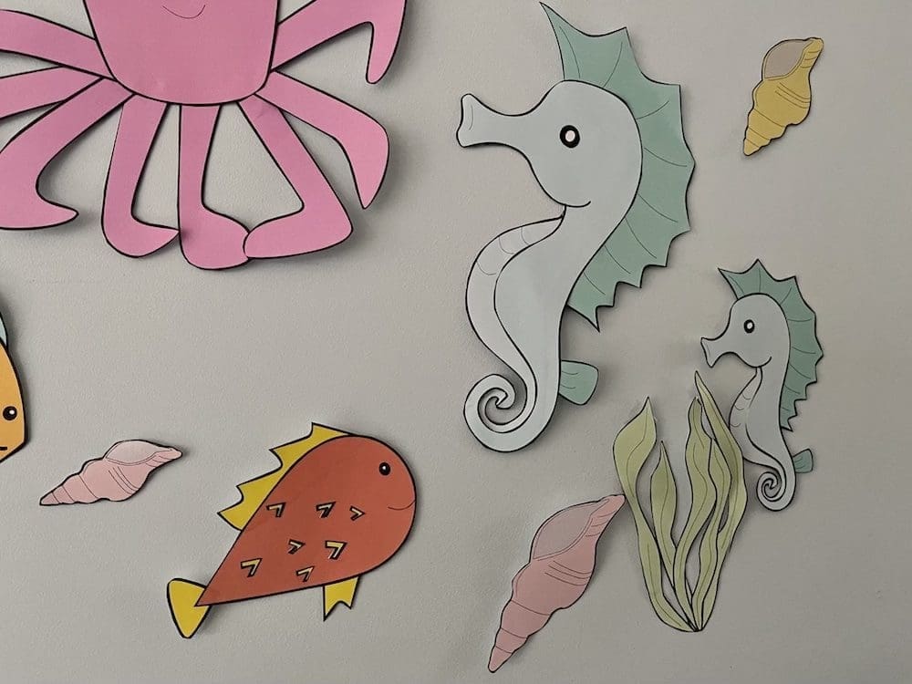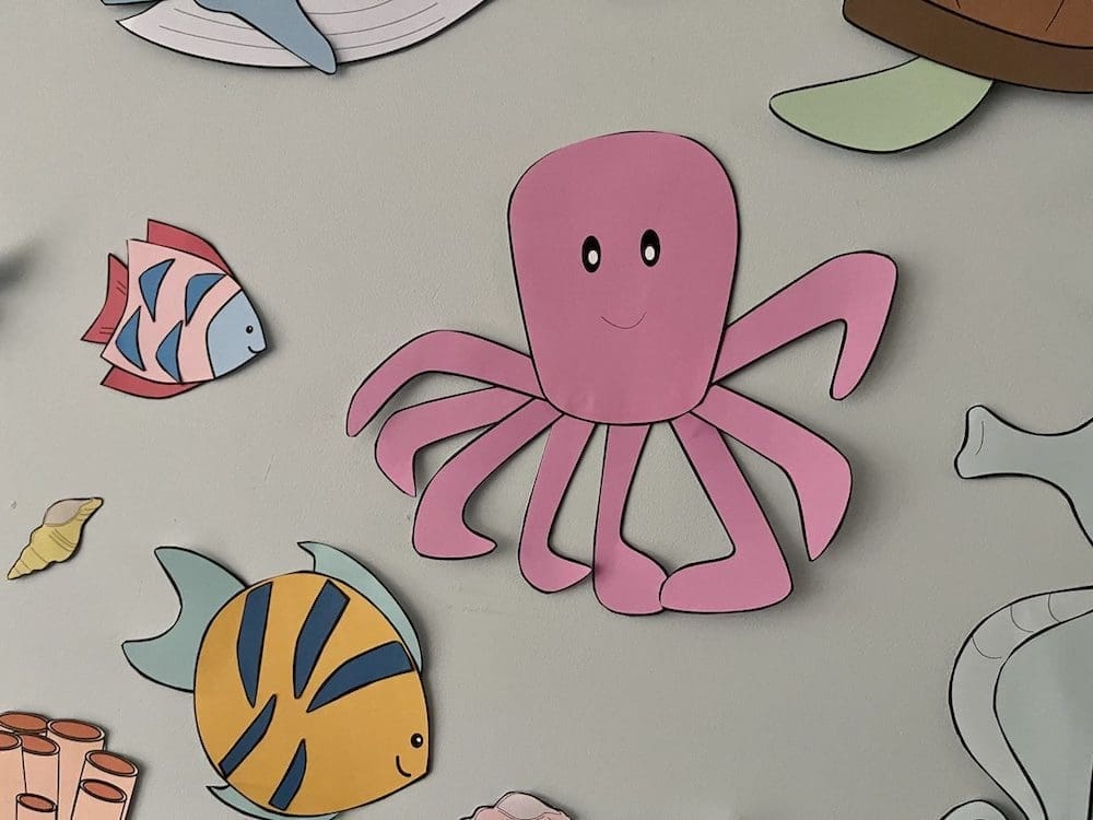 Daarnaast maak je een onderwaterwereld helemaal af door de dieren op een blauwe achtergrond te plakken en bijvoorbeeld slierten van crêpe papier op te hangen.