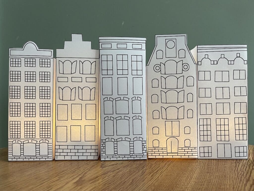 Met je schaar in de aanslag, knip de contouren van de sjablonen uit. Zorg ervoor dat je nauwkeurig knipt, zodat je papieren huisjes straks mooi in elkaar passen. Eventueel kun je een paar raampjes van de grachtenpanden uitknippen of uitprikken met een prikpen. Plak er vervolgens gekleurd vliegerpapier achter. Zo krijg je een extra leuk effect wanneer je het LED-theelichtje in het huisje zet. Daarnaast kun je de huisjes natuurlijk ook inkleuren met potloden of stiften.