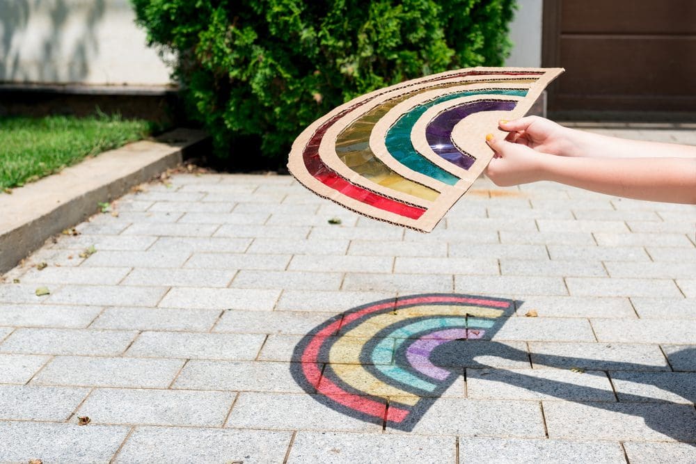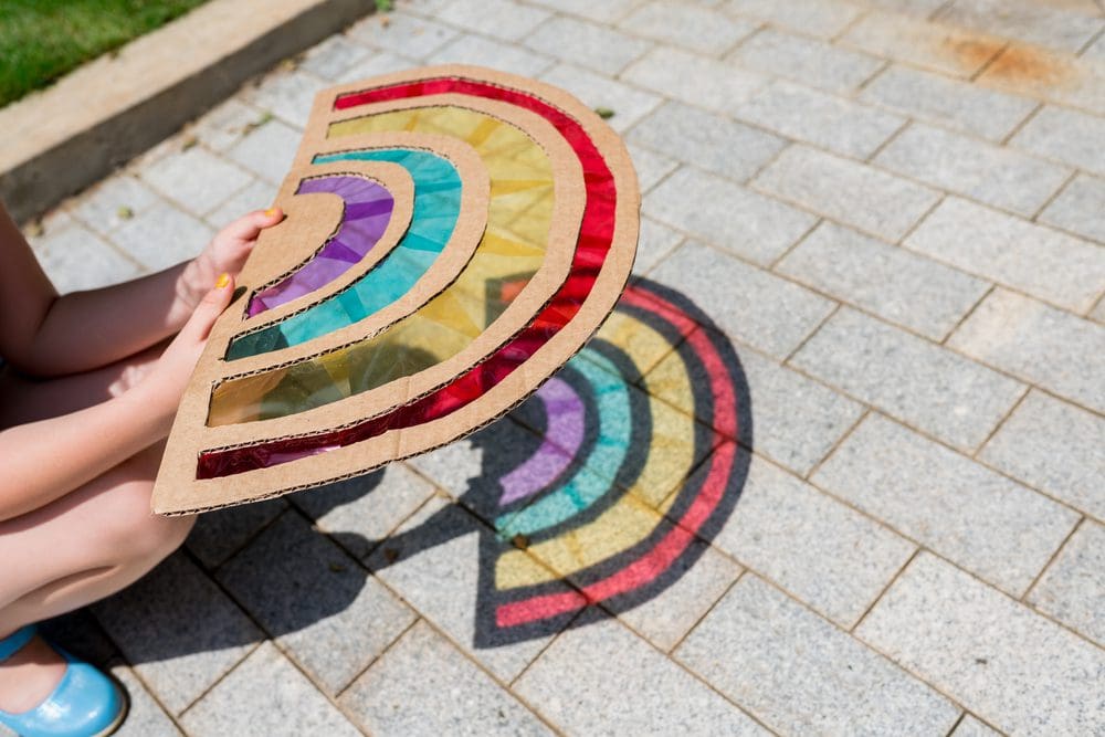 Geen zin in deze DIY? Dan kun je een zonnevanger ook gewoon kopen. Maar het maken van deze regenboog knutsel is heel eenvoudig. En voor een deel te maken met afval, want je kunt gewoon een oude kartonnen doos gebruiken. Je hoeft dus alleen maar een groot stuk karton te hebben, wat vliegerpapier, een prikpen of een scherpe schaar en een beetje lijm.