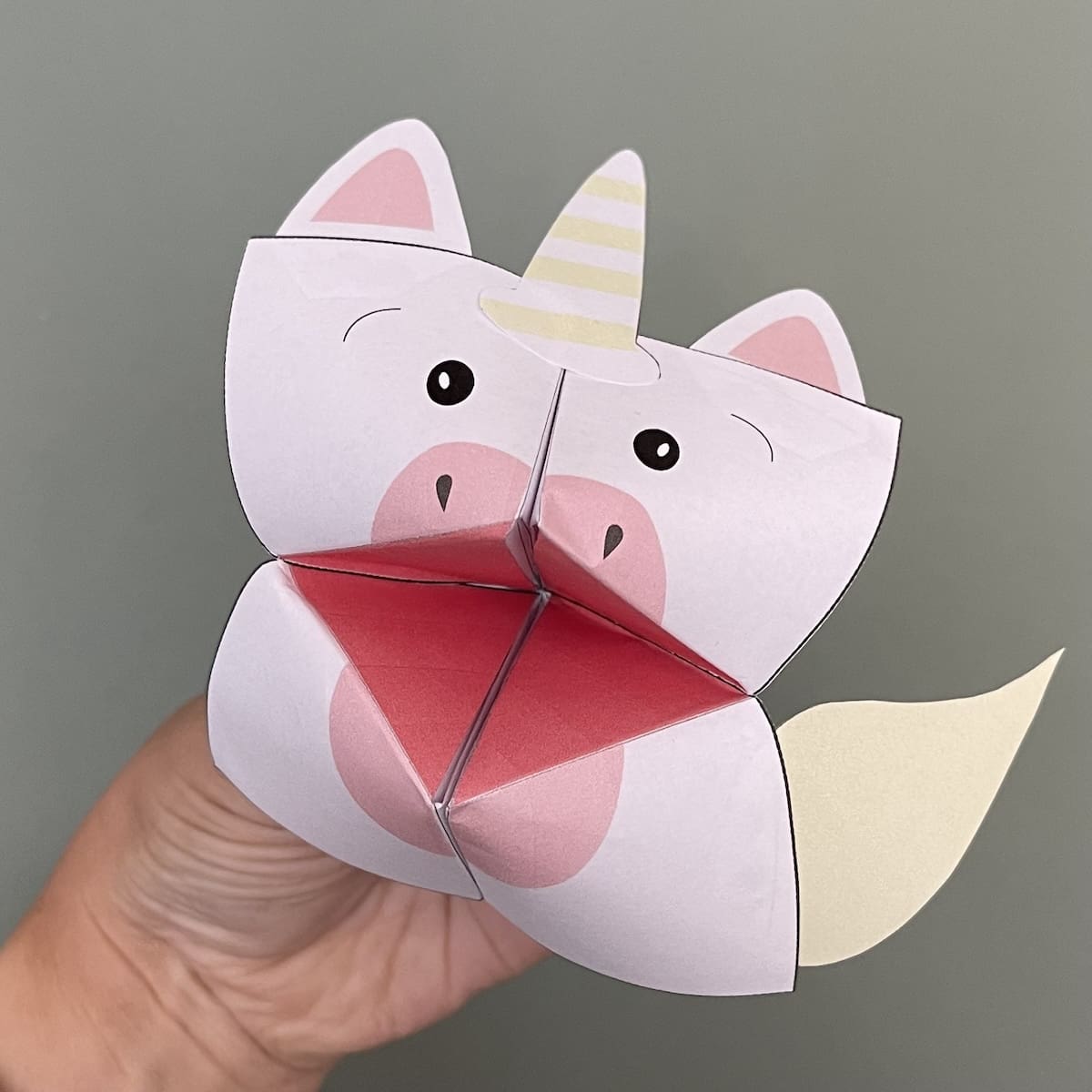 De laatste unicorn knutsel van dit printable pakket is het happertje. Voor deze knutsel moet je een happertje kunnen vouwen. Het is niet moeilijk, maar je moet het even weten. Hier vind je eventueel de instructies voor een happertje vouwen. Het is in ieder geval een leuke bezigheid voor kinderen. En dat het eindresultaat een unicorn is, is natuurlijk een kers op de taart!