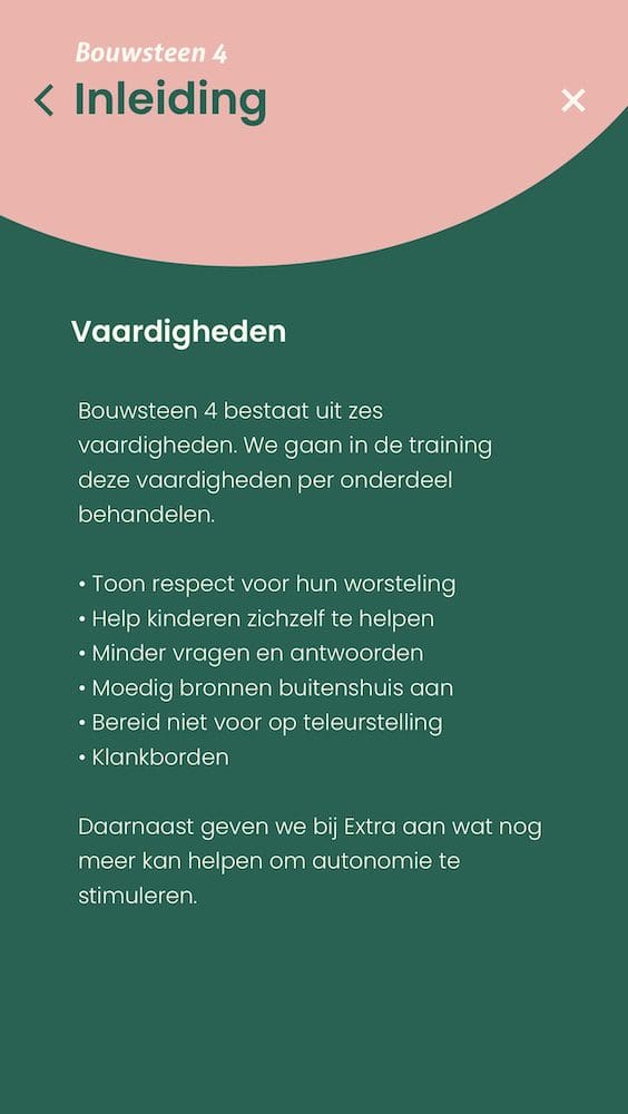 De app bevat de volledige Howtotalk training. In zes interactieve modules leer je hoe je je communicatie met je kinderen kunt verbeteren. Deze zes interactieve modules, ze noemen dit in de app ‘bouwstenen’ doorloop je door oefeningen te doen. Dit kun je helemaal op je eigen tempo en in je eigen tijd doen. En heel handig, soms helpt de app je eraan herinneren dat er weer getraind kan worden.