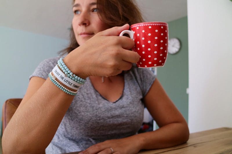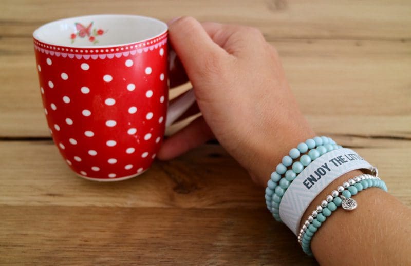 Met kleine kinderen en vooral de grijpgrage handjes van kleine kinderen, zijn sieraden geen goed idee. Toch word ik blij van sieraden. En omdat ik nu die grijpgrage handjes aardig onder controle heb, kan ik weer sieraden dragen. Je hoeft niet meer met peperdure juwelen aan te komen. Maar gewoon sieraden. Mooi en leuk, sieraden die een outfit opfleuren. En waar kun je dat nu beter bestellen dan bij een webshop die ‘Gewoon! Sieraden’ heet? Mijn nieuwste aanwinst waarmee ik mezelf verwend heb, is een leren armband met de tekst ‘Enjoy the little things’. Het zijn de kleine, simpele maar oh zo persoonlijke dingen.