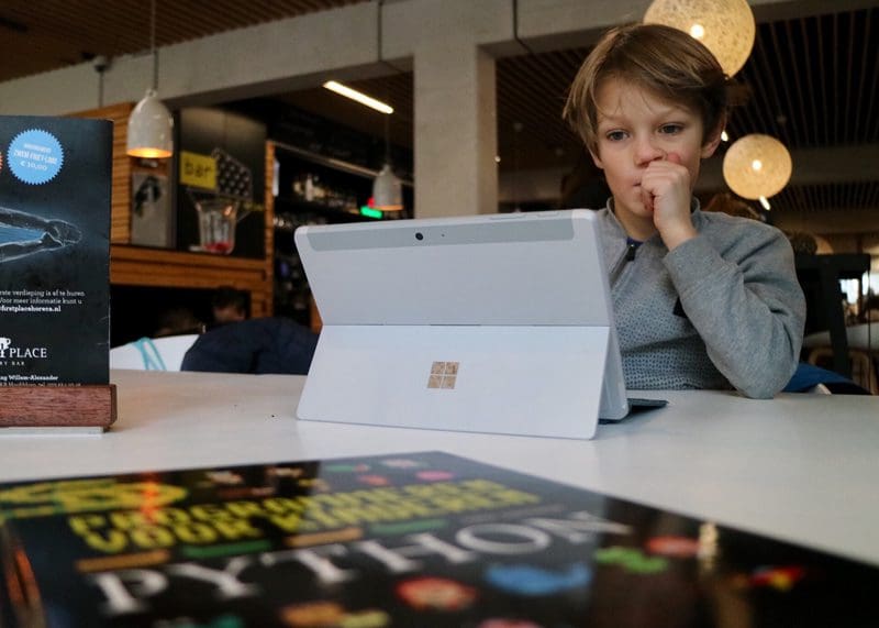 We kregen de Microsoft Surface Go drie weken om te reviewen. In die weken probeerden we het apparaat zo goed mogelijk te leren kennen. Mijn man wil de kinderen graag een beetje leren programmeren. Hij ontdekte al snel dat dit prima kan op de Surface Go. Hoe fijn was het dat Sinterklaas het boek ‘Python – programmeren voor kinderen’, in de zak had gedaan!? Tijdens de zwemles van mijn dochter heeft mijn zoon dan ook zijn allereerste stukje geprogrammeerd op de Microsoft Surface Go.