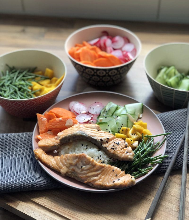 De frisse mango-zalmbowl paste perfect in onze nieuwe zogenaamde tactiek. Hoewel de bijgerechten voornamelijk nieuw waren voor mijn kinderen, namelijk zeekraal en radijs, kon ik deze ingrediënten heel gemakkelijk apart in bakjes op tafel zetten.