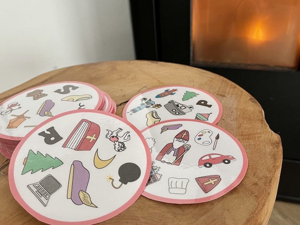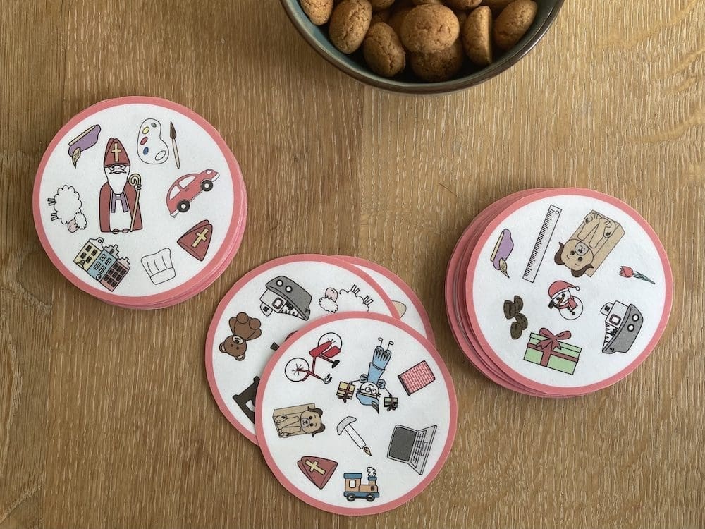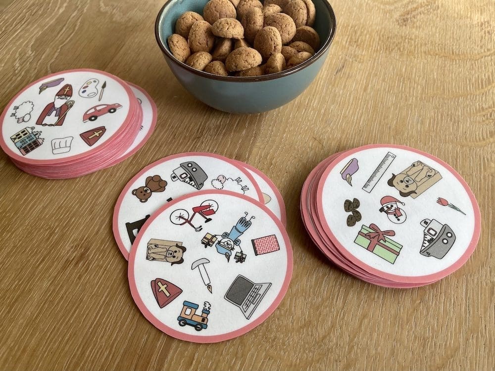 Ik heb het over het Sinterklaas spel matchen, onze variant op het spelletje Dobble. Deze printable bestaat uit prints met 54 kaartjes waarop acht verschillende Sinterklaas symbolen staan. Elke twee kaarten hebben precies één symbool gemeen. En soms zie je het heel snel, maar soms zie je het gewoon echt niet. Toch zul je uiteindelijk zien, er is altijd een symbool dat matcht.
